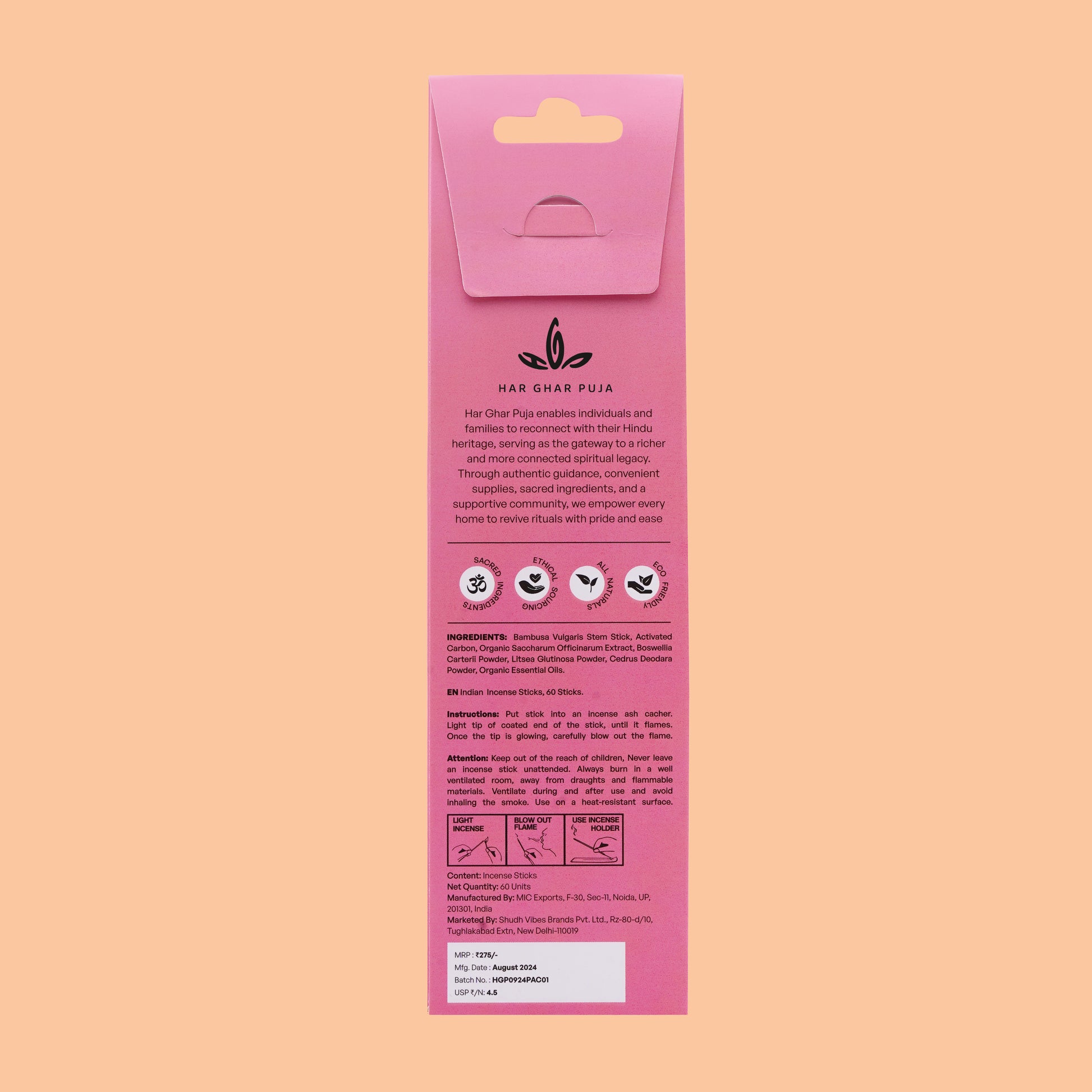 How to use: Light the upper tip of the incense stick with a matchstick. After the tip catches fire, softly extinguish the flame and place the incense stick safely on an Agarbatti stand.