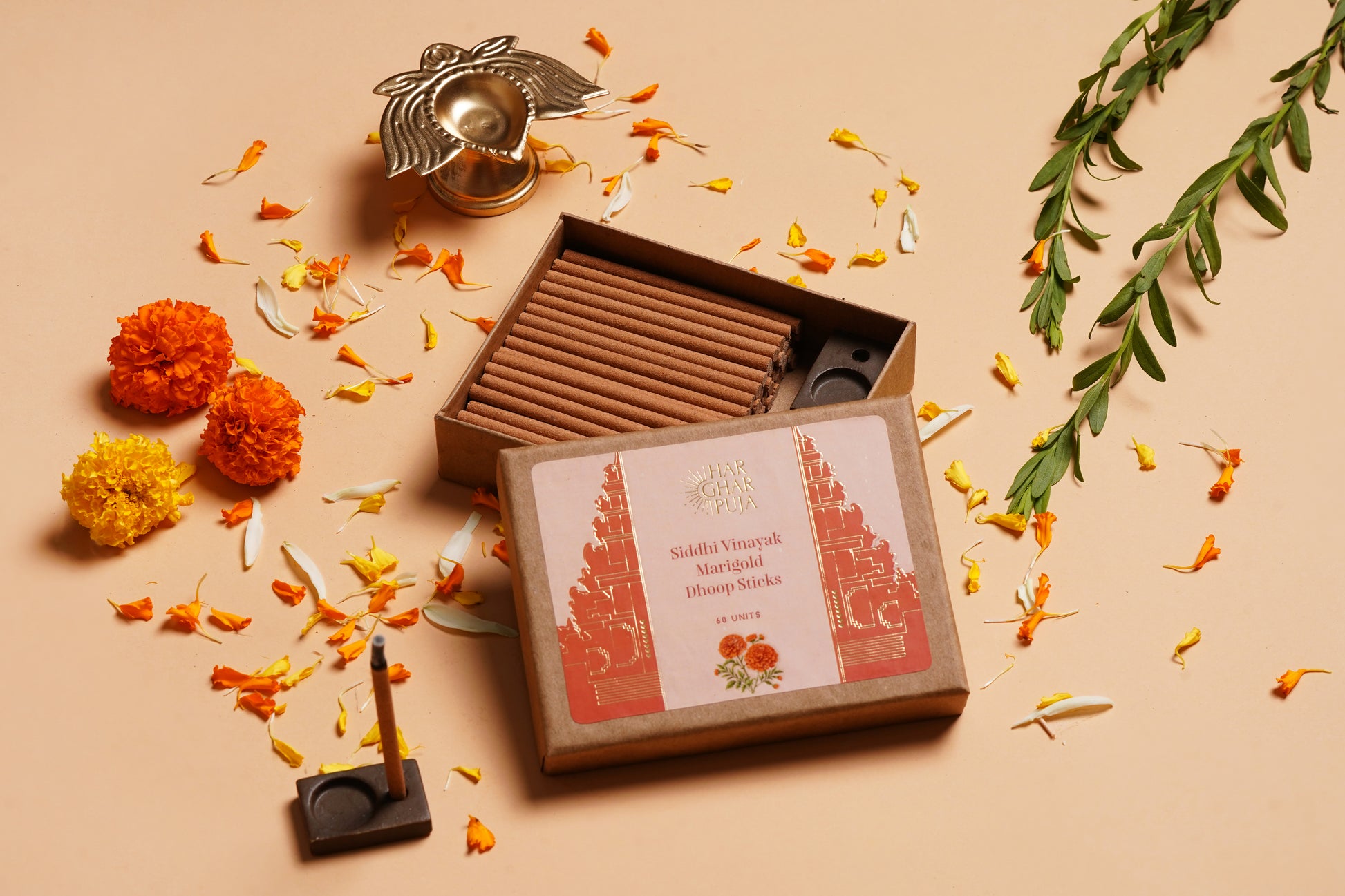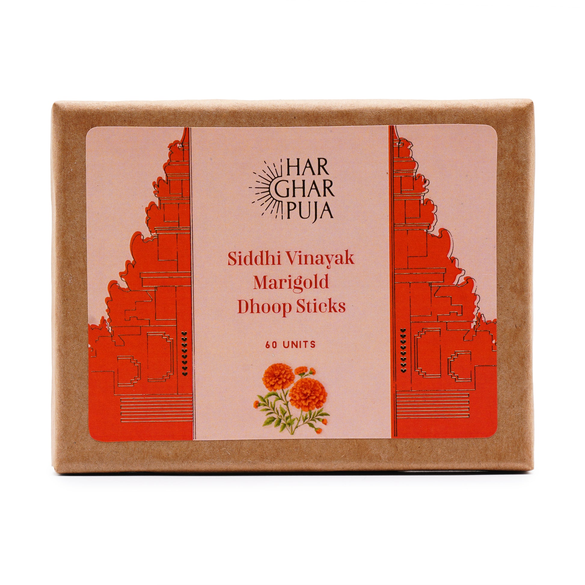 Marigold Dhoop Sticks: Infused with the divine essence of marigold flowers offered to Lord Ganesha, these sticks symbolize prosperity and the removal of obstacles. Ganesha, the revered remover of hurdles, is celebrated at the Siddhivinayak Temple in Mumbai and worshipped globally. Lighting these marigold dhoop sticks fills your space with positivity, inviting success, wisdom, and divine blessings into your life.
