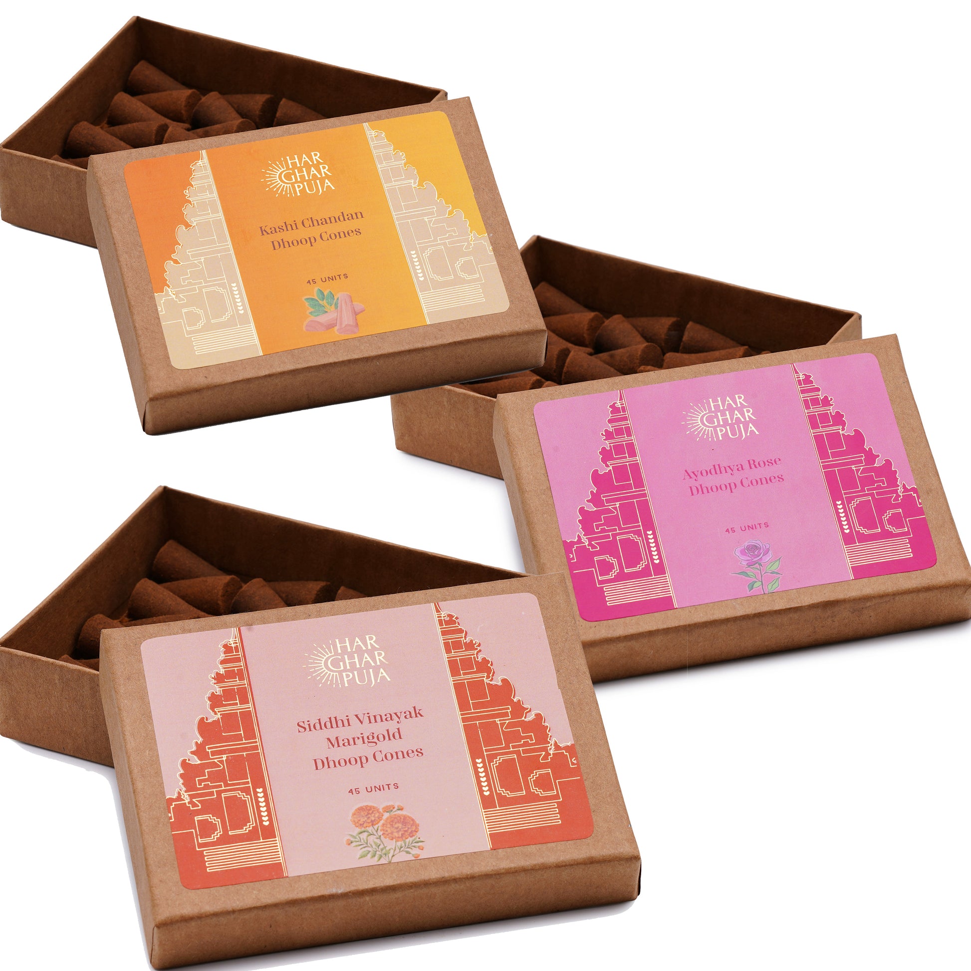 Har Ghar Puja Dhoop Cones (Ayodhya Rose, Siddhi Vinayak Marigold and Kashi Chandan)