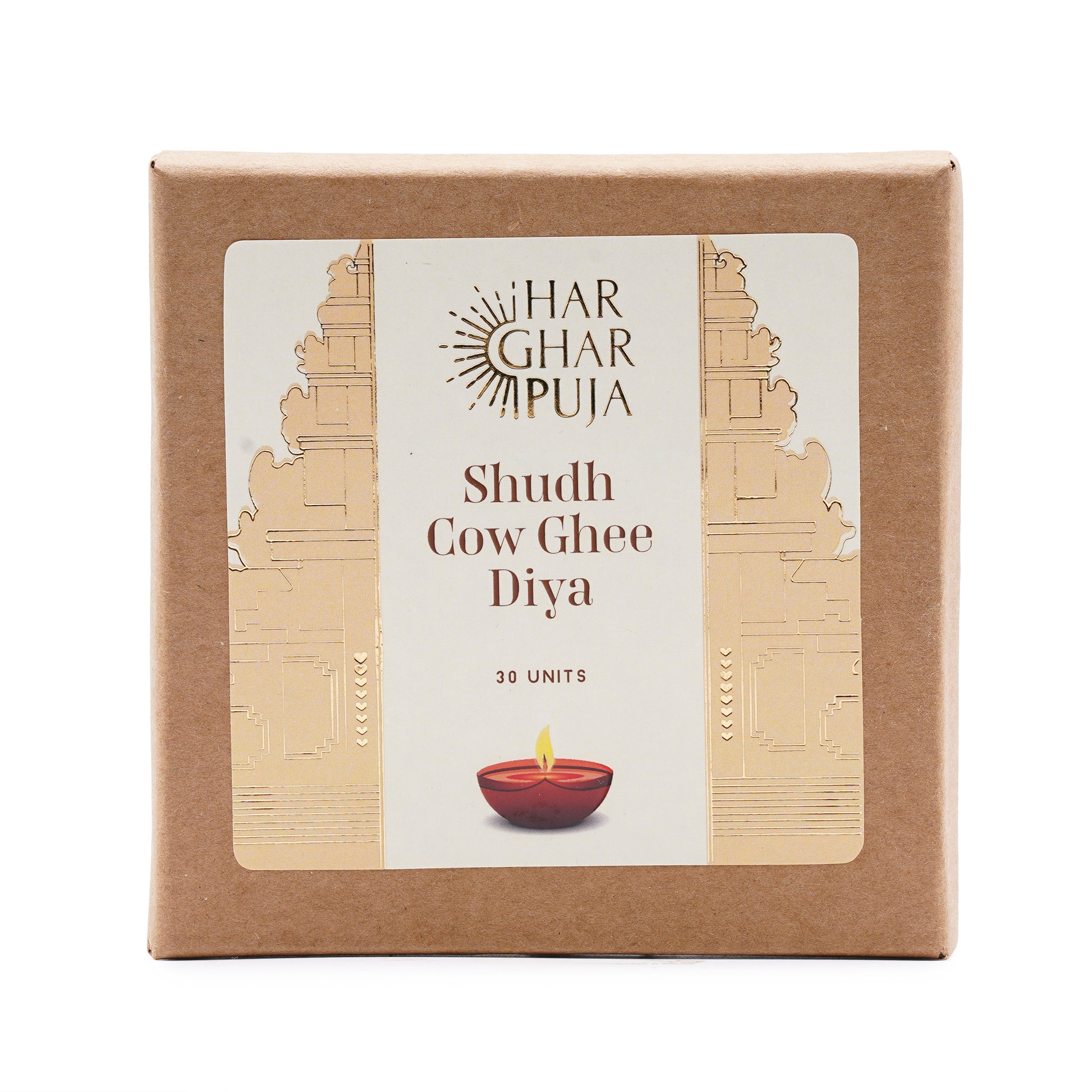 Ghee Diya: Lighting a ghee diya during worship is an age-old Hindu tradition that symbolizes purity, prosperity, and the removal of darkness. Crafted from pure cow ghee with aloe vera as a binding agent, these ready-to-use diyas burn with a bright, steady flame. Infused with sacred marigold flowers, the flame creates a peaceful ambiance that invokes divine blessings and purifies your surroundings.