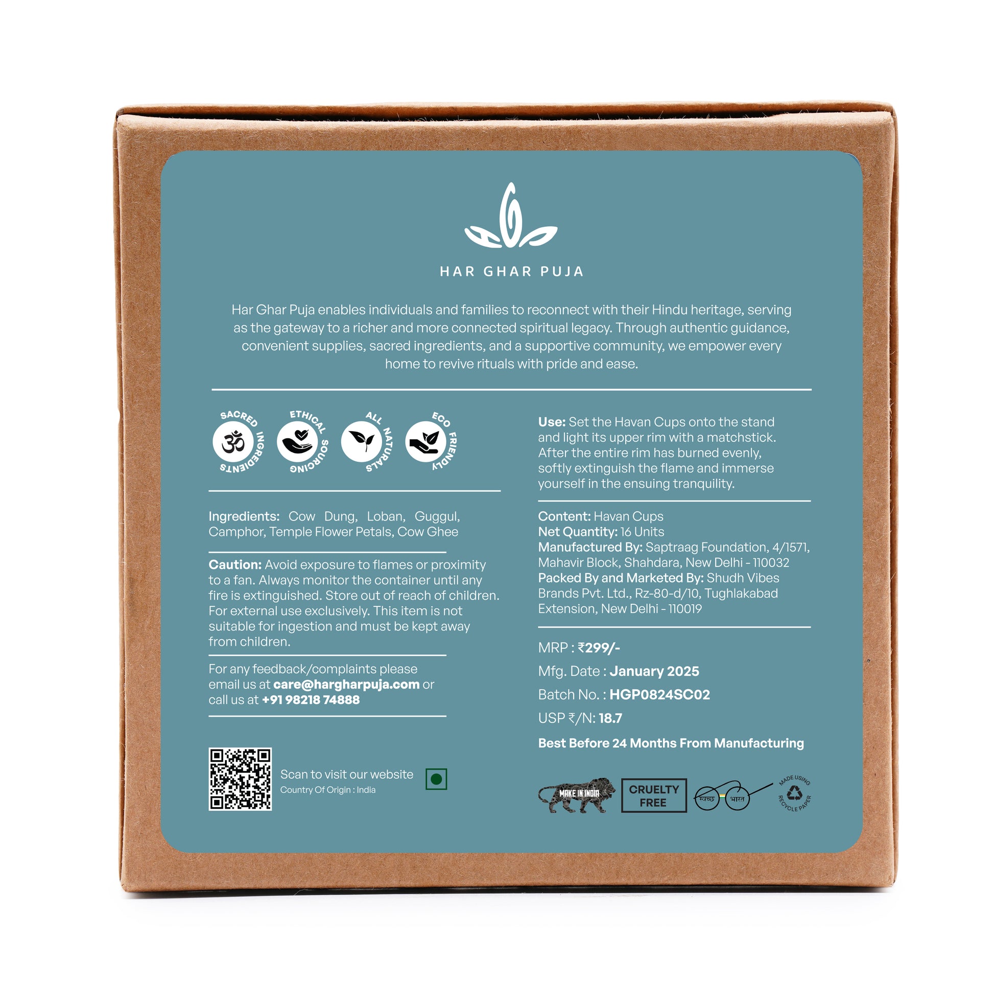 Caution: Avoid exposure to flames or proximity to a fan. Always monitor until the fire is extinguished. Keep the havan cup on the provided base to prevent black spots. Store out of reach of children. External Use Only: Not suitable for ingestion; keep away from children.