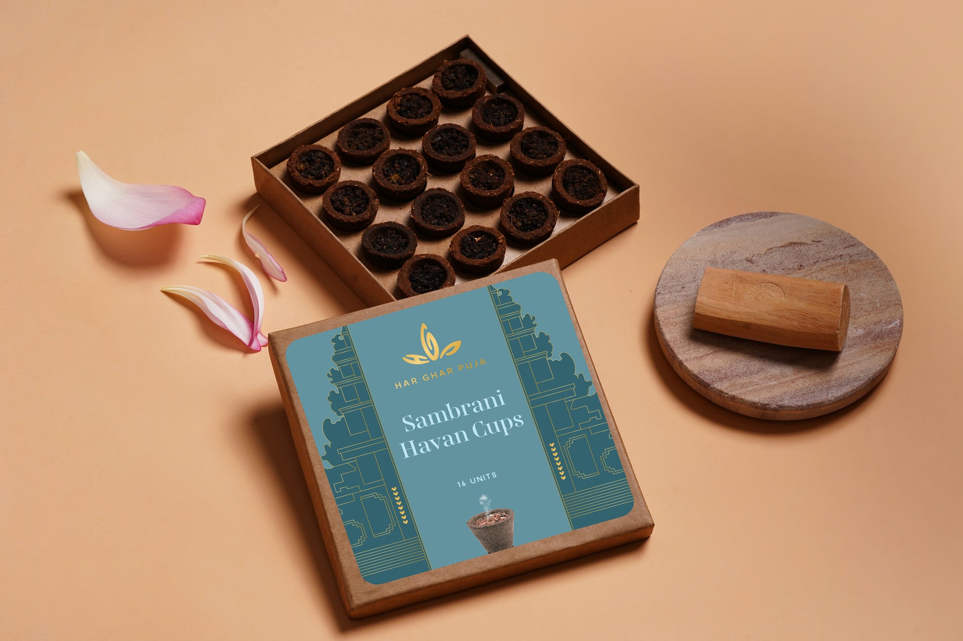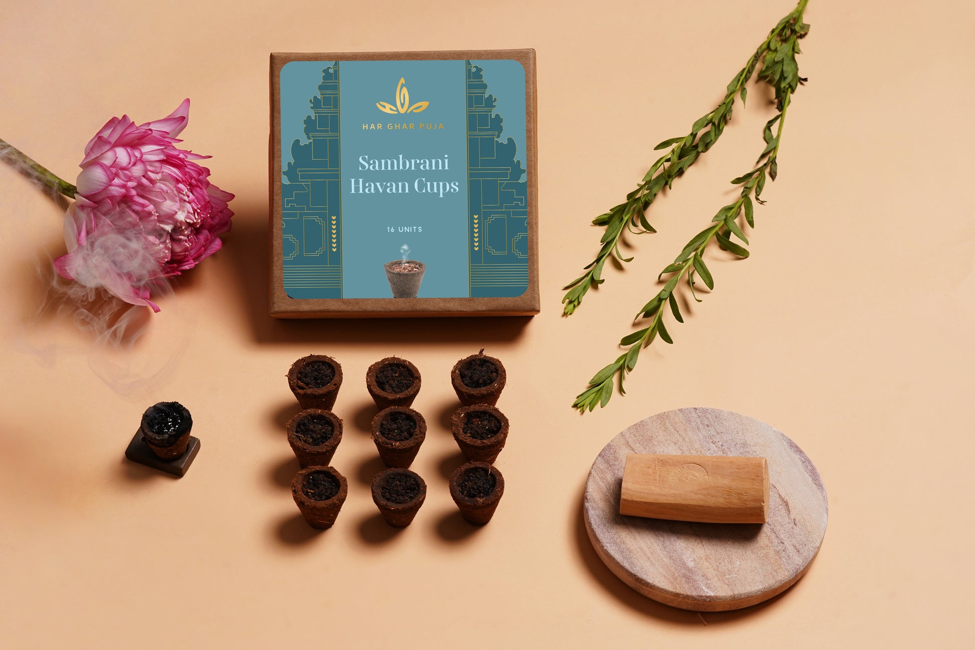 Sambrani cups, also known as Havan cups, are used during pujas in Indian households and Hindu rituals. Made by blending natural resins, herbs, ghee, and other fragrant ingredients, these hand-pressed cups release fragrant smoke when lit, purifying the air, invoking blessings, and creating a peaceful atmosphere. Integral to Indian ceremonies for centuries, they cleanse negativity, rejuvenate the senses, and facilitate divine connection between humans and the divine during havan or homa rituals.